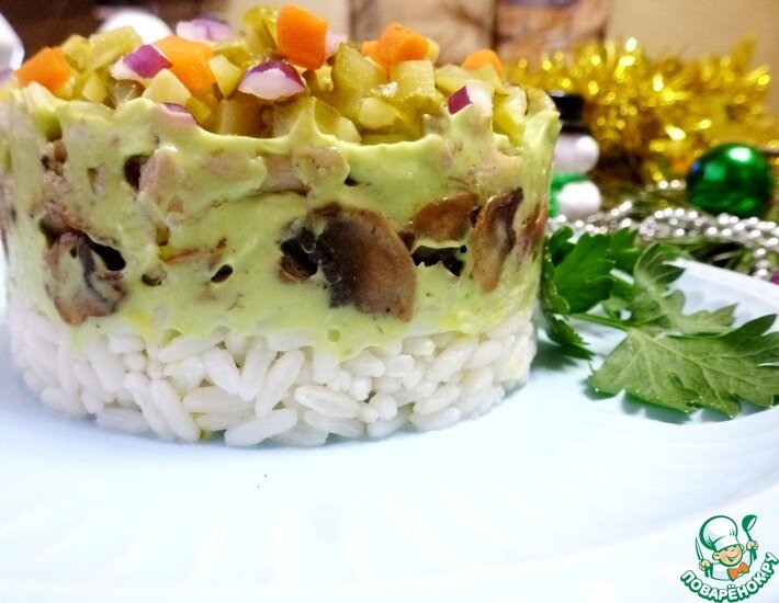 Салат вкусный, сытный и лаконичный. В этом салате изюминка в заправке из авокадо с чесноком и соком лимона. Советую присмотреться к ней, она отличная замена майонезу, более вкусная, ароматная и полезная. Она может использоваться и для других салатов. Ингредиенты для «Салат "Конфетти" с курицей и грибами»: Рецепт «Салат "Конфетти" с курицей и грибами»: В этом салате изюминка в заправке. Подготовим авокадо, оливковое масло, сок лимона, чеснок, соль и перец по вкусу. Авокадо почистить и нарезать, чеснок выдавить через пресс, влить масло и пробить все блендером до состояния пюре. Пробуйте на вкус и добавляйте чего не хватает. Шампиньоны нарезать тонкими пластинками и отправить на сухую сковороду. Выделится много сока, тушить пока сок не выпарится, затем влить масло и немного поджарить. Советую сильно не зажаривать, пусть грибы останутся сочными. Салат собирается слоями. Первый слой варёный рис. Смазать этот слой приготовленной заправкой из авокадо с чесноком. Второй слой - обжаренные шампи