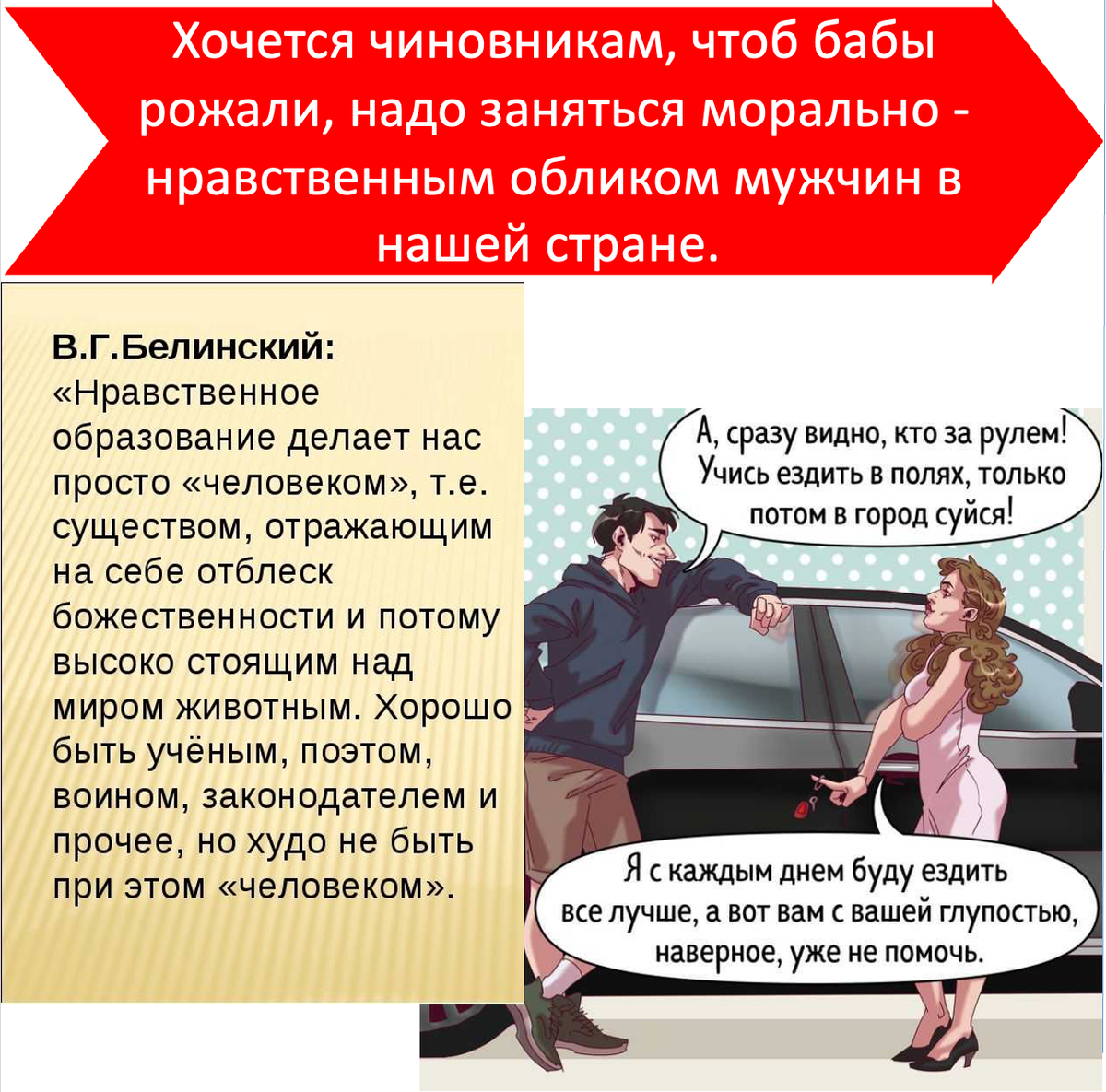 5. Морально - нравственное воспитание... мужчин. Хочется чиновникам, чтоб бабы рожали, надо наконец заняться морально - нравственным обликом мужчин в нашей стране. Почему то все говорят о женщинах - запретить аборты, запретить образование и пр. Но женщина делает ребенка НЕ одна. Растит часто одна. Но делает не одна! Поэтому не обращать внимания в вопросе рождаемости на то, а что там с мужчинам - верх глупости.