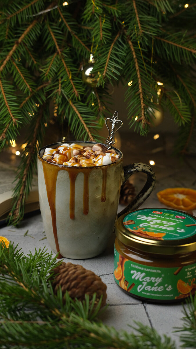 Разливаем по кружкам, украшаем маршмеллоу и поливаем от души карамелью с корицей и апельсином (я беру от Mary Jane’s) Вместо маршмеллоу можно добавить взбитые сливки, а если вы не лю