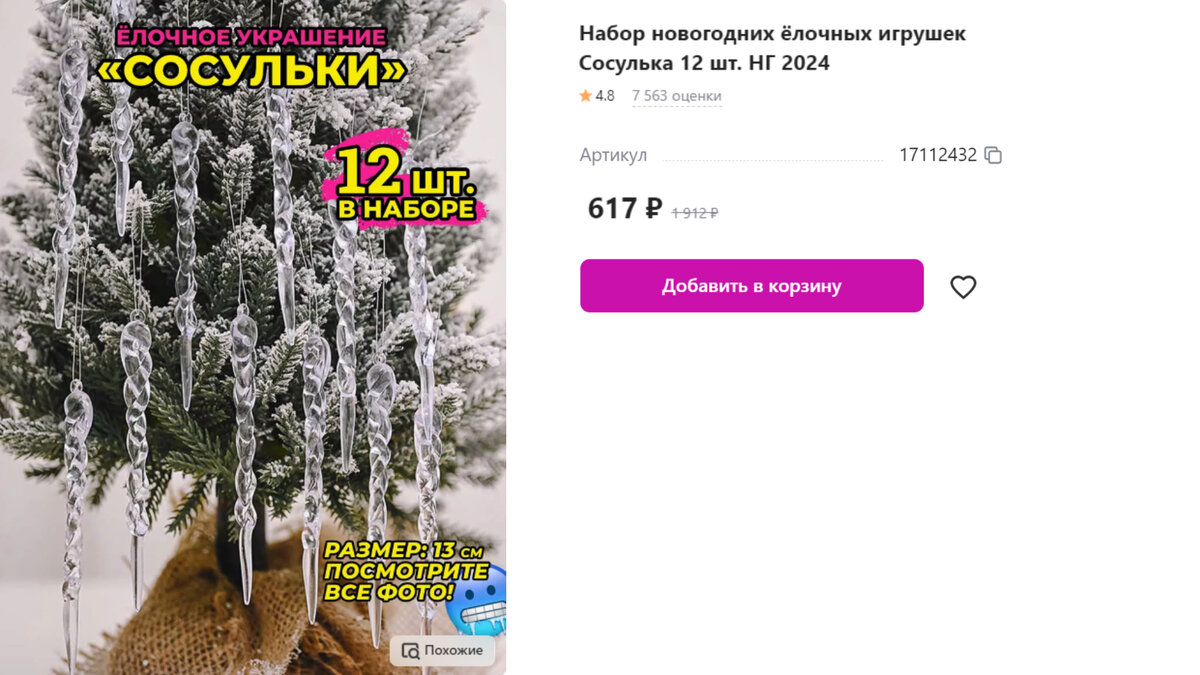 1. Набор новогодних ёлочных игрушек Сосулька 12 шт. Именно для такого сказочного времени года, как зима и зимних праздников, морозных вечеров, были созданы, имитирующие лед холодные; прозрачные, сияющие, весёлые, свисающие; висячие и небьющиеся сосульки - подвески в виде крученных витых спиралей. Артикул 17112432 2. Набор елочных украшений Елочные украшения - один из главных атрибутов Нового года и Рождества. Ни один человек не представляет себе Новый 2024 год без нарядной ёлочки, украшенной переливающимися сияющими игрушками бантиками и крылышками ангела. Артикул 191348796 3. Снежинка Новогодняя Наши новогодние снежинки подвески станут прекрасным дополнением к вашему декору. Снежинки на елку выполнены из акрила. Поэтому елочные украшения не боятся падения. Что несомненно плюс, если в доме есть дети и животные. Снежинки выглядят эстетично, поэтому станут прекрасным подарком вашим близким. Артикул 191902947 4. Набор новогодних шаров на ёлку Новый год это волшебный праздник. Роскошный