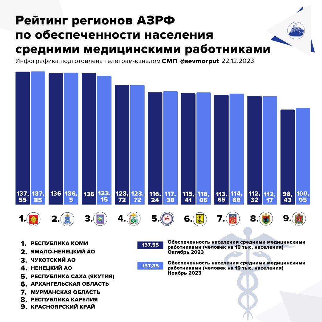 За месяц количество работников среднего медицинского персонала подросло почти во всех регионах АЗРФ. Снижение их числа зафиксировано лишь на Чукотке, которую возглавляет Владислав Кузнецов, и в Карелии, руководимой Артуром Парфенчиковым. В последней, впрочем, совсем незначительно. Лидером Арктики по обеспеченности населения средним медперсоналом стала Республика Коми, которую возглавляет Владимир Уйба — здесь их почти 138 на 10 тысяч жителей. За месяц число специалистов в регионе выросло на 0,2%.