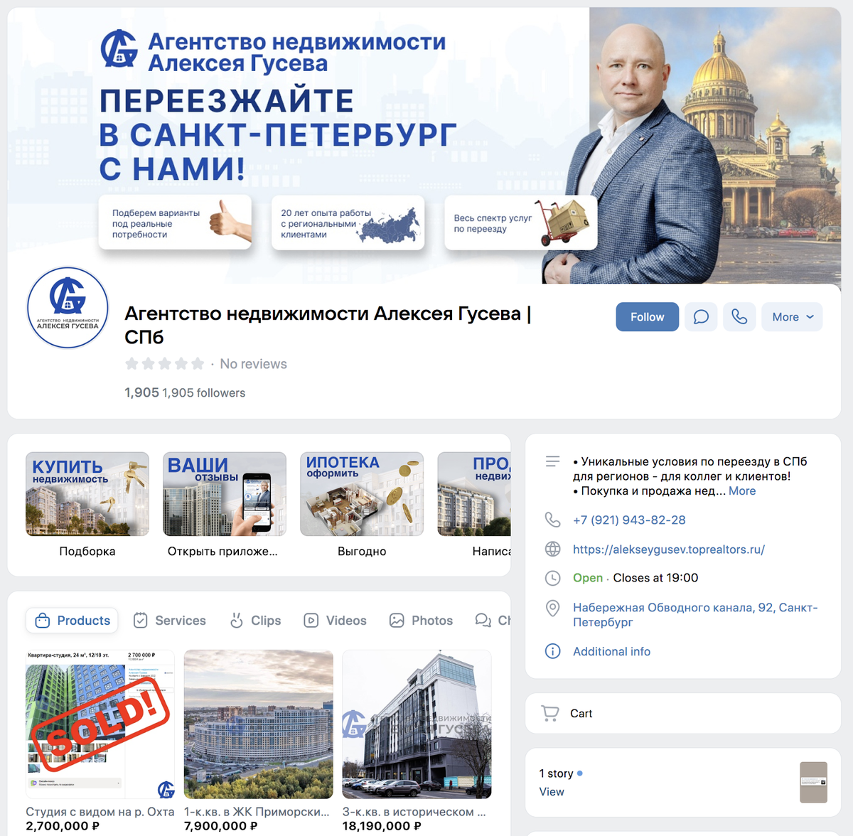 У его агентства отлично продуманная страница в ВК, красиво оформленная и формирующая у посетителя впечатление очень позитивной, приятной в общении и надежной в сотрудничестве компании. И уже неважно, что мало подписчиков и отзывами придется идти на сторонние порталы, Яндекс и Google. По одежке же встречают и она, безусловно, хороша.
