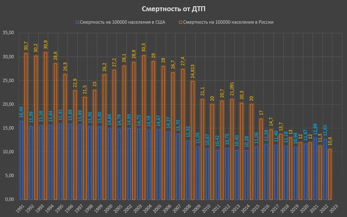 Мы уже ниже, чем в США. Кто-то скажет, что там больше машин на душу населения, да и ездят больше. Только это говорит опять же в нашу пользу. Чем больше машин, тем [по идее] выше культура автовождения, тем меньше аварий. Действительно, всплеск аварий в девяностые был вызван двумя причинами: общим бардаком в стране, который выливался в плохие дороги и безнаказанность для лихачей, и в резкое повышение доступности товаров для населения, из-за которого за рулём оказалась непропорционально большая доля водителей-новичков.