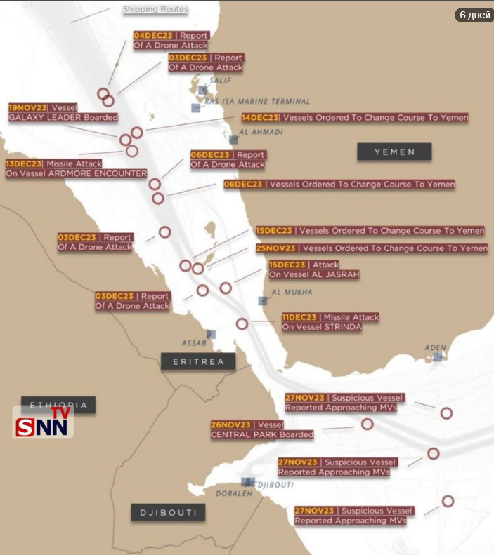 Хуситы перекрыли Баб-эль-Мандебский пролив, с целью заблокировать суда имеющие отношение к Израйлю. Беспилотниками и другими средствами атакованы уже десятки теплоходов под флагом разных стран. Некоторые из них атакованы военными в лодках и отбуксированы в порты подконтрольные хусидам. 23 ноября хуситы провели атаки, с помощью беспилотных летательных аппаратов (БПЛА), двух нефтяных танкеров, которые шли под флагом Норвегии и Индии в Красном море. Крупнейшие перевозчики Maersk и Hapag-Lloyd приостановили свои рейсы через Красное море сразу же после недавних атак, за ними последовали CMA CGM и MSC. На карте расположение судов крупной англиской компании, которая прекратила движение через Суэцкий канал и направила свои суда на юг Африки, к мысу Доброй Надежды. Такой маршрут удорожает каждый рейс на 1млн. руб и делает его на 7 -10 дней длиннее, что приведет к полному сбою графика контейнейнерных перевозок и значительному подорожанию всех перевозимых товаров. Кроме того значительно подор