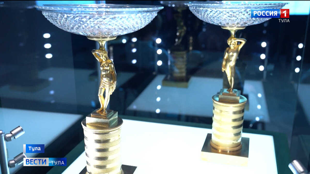 На выставке шедевров императорского стеклянного завода, который проходит в тульском филиале гима обновление экспонатов, посетители увидят настоящий эксклюзив, хрустальные вазы на скульптурных ножках и в золочёной бронзе выполнены они в виде фигурок, юноши и девушки, стиль ампир отсылает к античным традициям. Работу относят к 1820 году. Именно тогда императорский стеклянный завод начал производить монументальные изделия из стекла и хрусталя. Как и многие другие предметы вазы, были изготовлены по заказу императорского двора. Елена Смирнова, эксперт, заведующая отдела керамики и стекла ГИМа: Это вещи не просто для украшения интерьера. Они имеют совершенно конкретную функцию. Это ваза для фруктов, и более того, вот эти фигуры юноши и девушки это, конечно, ещё олицетворение такое символическое. Зачастую это было олицетворение времён года весны и осени, как правило, особенно когда это все увенчивалось фруктами и получалось такой уже символ совершенно законченный.А когда фрукты в эти чаши не