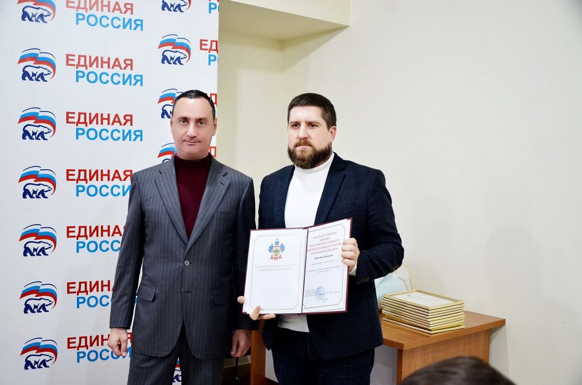 Как депутат Законодательного Собрания Краснодарского края, член фракции «Единая Россия» вручил Благодарность от регионального парламента председателю Общественного совета партийного проекта «Чистая страна» по городу Сочи Илье Рябову.