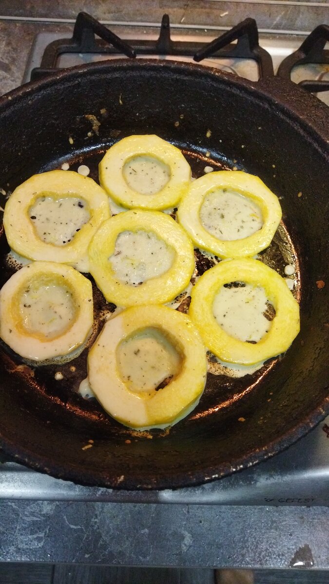Уже скоро Новый год, а в подвале ещё лежат кабачки. Что я только из них не готовила. Сегодня, как только я очистила кабачок от кожуры включилась импровизация. На основе моего опыта, решила придумать своё блюдо, даже не знаю как его назвать. 1. Нарезала очищенный кабачок кружочками. Вырезала ложкой серединку (она зрелая с семенами). 2. Приготовила кляр из муки, яйца, молока. Посолила(Консистенция блинного теста). 3. Обжарила кабачок на сковороде, предварительно окунув в кляр.В середину кольца налила немного кляра, чтобы можно было его начинить. 4. В фарш добавила чеснок и обжарила его на сковороде. 5. Выложила кольца на противень, предварительно застеленый пергаментом. Положила внутрь колец по помидорному кружку. 6. Сверху выложила фарш. При желании можно смазать сметаной или майонезом. 7. Посыпала тертым сыром. 8. Поставила в разогретую духовку на 15-20 минут. Приятного аппетита.
