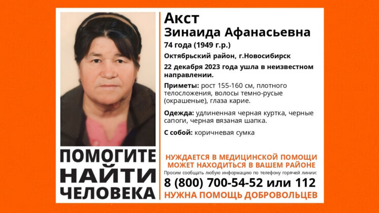 В Октябрьском районе Новосибирска без вести пропала 74-летняя Зинаида Акст. С 22 декабря 2023 года ее местонахождение неизвестно- женщина ушла в неизвестном направлении. Пенсионерку ищет поисково-спасательного отряда (ПСО) «ЛизаАлерт». Приметы пропавшей: рост 155-160 сантиметров, плотного телосложения, волосы темно-русые окрашенные, глаза карие. В день исчезновения была одета в удлиненную черную куртку, черные сапоги и черную вязаную шапку. С собой у сибирячки была коричневая сумка, волонтеры отметили, что женщина нуждается в медицинской помощи. Если у вас есть информация о местонахождении Зинаиды, сообщите об этом по телефону ПСО 8-800-700-54-52 или наберите 112. Ранее «Вести Новосибирск» писали, что в областном центре без вести пропал 64-летний седовласый мужчина.