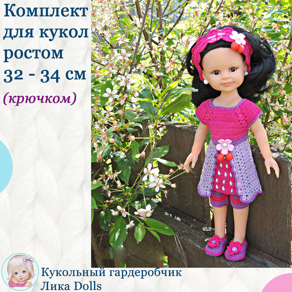 Присоединить нить темно сиреневого цвета, вяжем 2 ряда с убавками, для приталивания. (Если у кого изделие плотно сидит на куколке, убавки делать не нужно, просто при вязании добавить еще раппорт узора, сколько понадобится). Петли нужно разделить на три части: по центру нужно оставить 3 п., оставшиеся петли делим пополам. Вяжем темно сиреневым цветом.