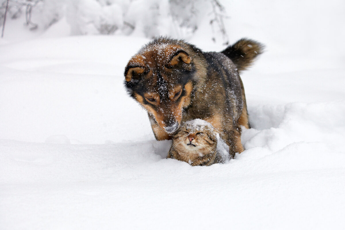 Но когда подошел вплотную к собаке, то не смог сдержать смех. В снегу был кот, который недовольно шипел на лающего Полкана. «Ну что, нашел себе друга?» — обратился Степан к псу. Тот посмотрел на хозяина счастливыми глазами и стал еще сильнее вилять хвостом.