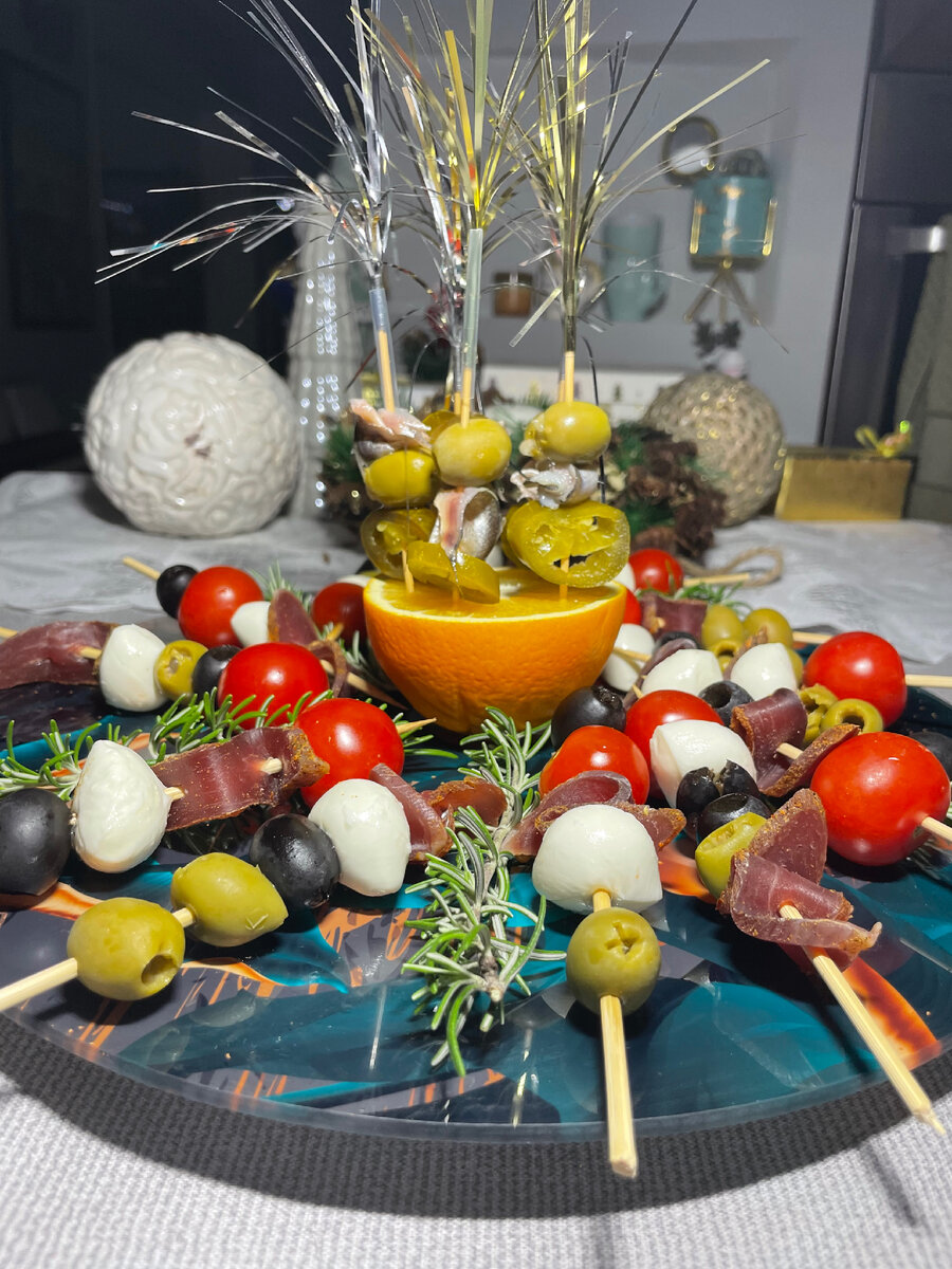 🍅Помидоры черри 250 гр. 🧀Моцарелла мини 1 пачка 🫒Оливки и маслины без косточек по 1/2 банки каждые. 🥓Вяленое мясо или колбаса 50 гр. 🐟Анчоусы (килька) 6 филе 🍊Апельсин 1 шт. 🌶️Перец Чили 6 долек 🌱Розмарин 5-6 веток( для украшения) Способ приготовления: 1. На большое плоское блюдо выкладываем ветки розмарина,а в центре половинку апельсина. 2. В соке половина апельсина замаринуем анчоусы. 3.Нанизываем на шпажки сыр,маслины,помидорки и мясо. Лучше сохранять хаотичную последовательность. Выкладываем по кругу между ветками розмарина. 4. Для рыбной закуски нанизываем на шпажки анчоусы,зеленые оливки и острый перчик. И выставляем их в центре,втыкая в апельсин. Приятного аппетита и с наступающим Новым годом🎄
