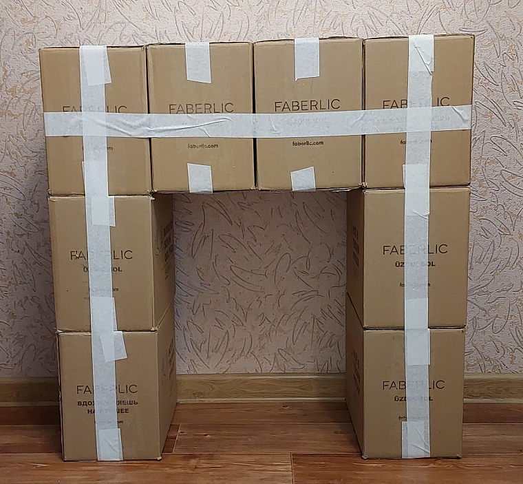 Потребуется: Приступим к работе. Для начала сделаем основу камина. Заклеим все коробки скотчем. Кладём нужной формы, затем скрепляем их вместе. Когда будете скреплять, нужно как можно крепче их соединить, чтобы они в дальнейшем не распались и держали форму. Для этого мне понадобилось 8 коробок. Из остальных вырезаем кусочки, похожие на кирпичики. Они должны быть разные по длине.