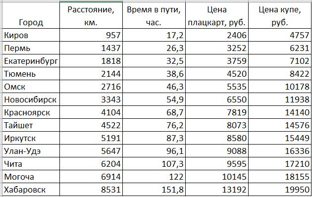 - в качестве базового направления для исследования выбран маршрут Москва - Владивосток. При этом в качестве точек для определения парных значений (x, y) взяты станции ан участке Киров - Хабаровск (т.е. отброшен начальный и конечный отрезок пути);