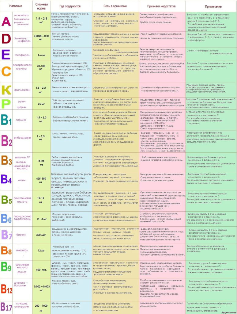 В таблице можно найти более подробные списки по продуктам, в которых содержатся определенные витамины.