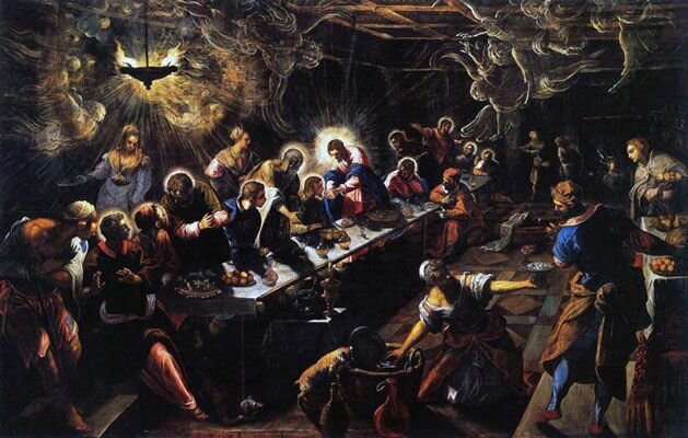 Тайная вечеря Художник: Тинторетто В этом изображении Тайной вечери активно используется светотень для создания захватывающей сцены, где стены оживают от кружащихся призракообразных явлений, в то время как освещенные ангелы окружают горящую лампу. Христос находится в центре сцены, ярко освещенный ореолом, который окружает его голову и верхнюю часть тела, когда он, стоя, предлагает хлеб ученику. Ореолы меньшего размера обозначают учеников, сидящих за длинным столом, занятых приватными беседами или погруженных в уединенные размышления. Лишь немногие внимательны к Христу, и сцена, словно в венецианской таверне, напоминает некое светское сборище, хаотичное и оживленное. Диагональ стола создает асимметричную композицию, в центре внимания которой находятся слуги. Подчеркнутая светом над головой женщина с блюдом в руках привлекает внимание зрителя к левой верхней части холста, в то время как коленопреклоненная женщина, протягивающая тарелку мужчине слева от нее, заполняет передний план. Свет