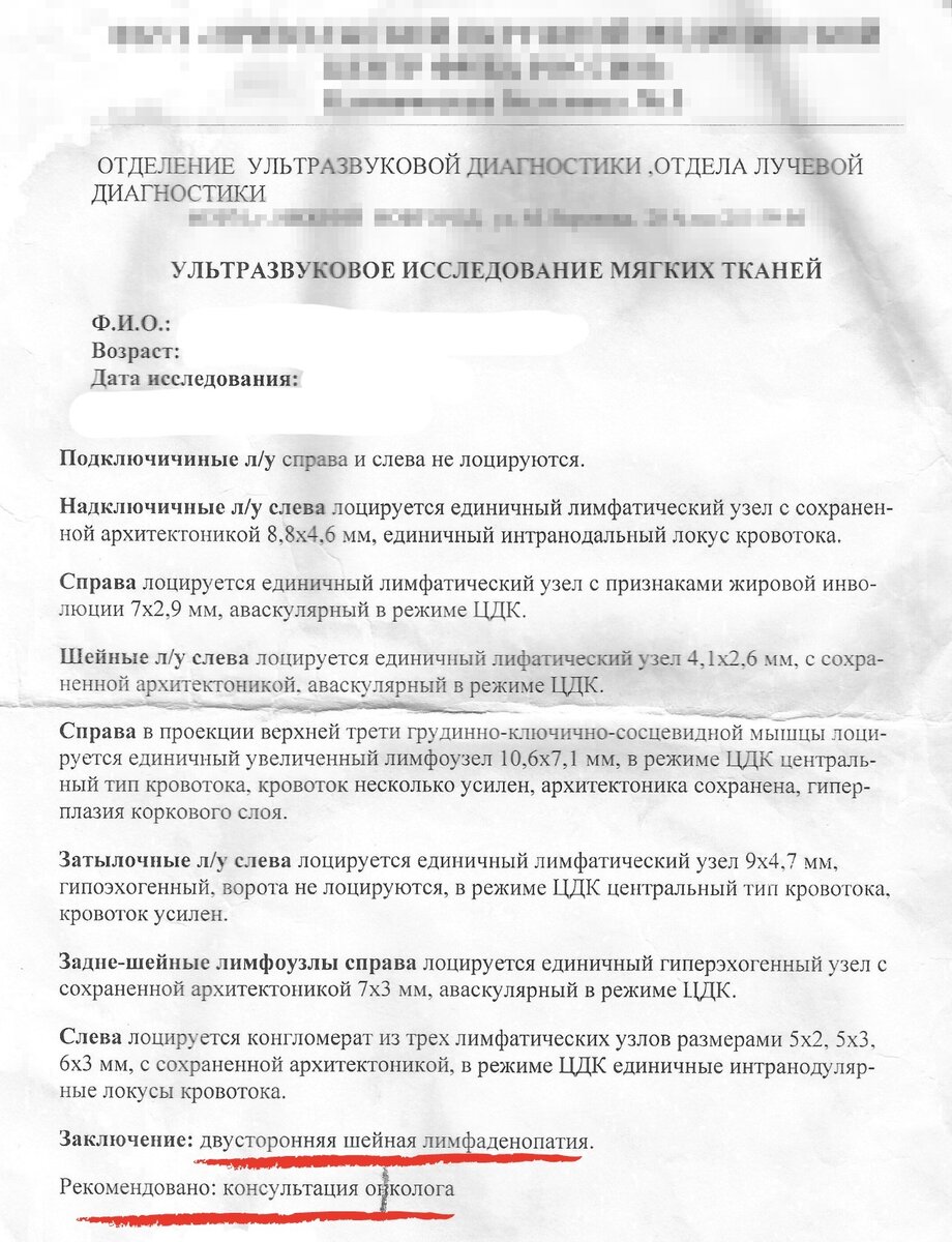 Получил на руки заключение: «Двухсторонняя шейная лимфоаденопатия. Рекомендована консультация онколога».