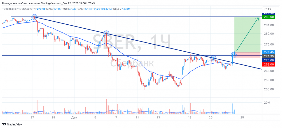 Сегодня глава Сбера Герман Греф выступил с положительными заявлениями. Он сказал: "Мы планируем и далее рост нашей прибыли из года в год, никакого её падения в 2024 г. и 2025 г. не будет". Также, добавил: "Акционерам Сбера стоит ждать рекордных дивидендов за 2023 г." Напомню, по нашим оценкам, Сбер может выплатить дивиденды за 2023 г. в размере 33 руб. на оба типа акций. Информация не новая, но акции отреагировали ростом более чем на 2%. Такое обычно происходит, когда на рынке царит оптимизм. На каждую положительную новость или высказывания рынок реагирует ростом, а негативные новости игнорируются. Учитывая то, что я жду ралли. Об этом писал здесь. Можно попробовать спекульнуть. Технически, акции Сбера на часовом графике пробили локальный нисходящий тренд и 50ЕМА, после чего был пробой уровня сопротивления на повышенном объёме и затем его ретест. Если новогоднее ралли продолжится до конца января, котировки Сбера могут вырасти до уровня сопротивления – 288 руб. Мы продолжаем откровенно