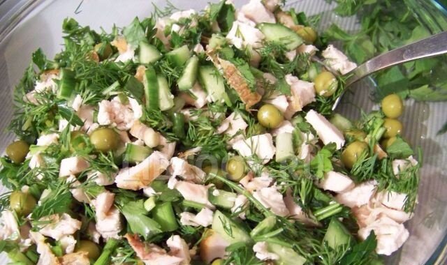 Скоро Новый год, а значит пора подумать о том, что приготовить на стол вкусного и полезного. Сегодня будет салат "Елисейские поля". Не факт, что он имеет отношение к Франции, но получается очень вкусным. Ингридиенты: • Куриная грудка варёная, без кожи — 250-300 г • Огурец свежий — 1 шт • Горошек зелёный консервированный — 0,5 бан. • Лук зелёный — небольшой пучок • Укроп свежий • Петрушка свежая • Масло оливковое — 3 ст. л. • Уксус винный — 0,5 ст. л. • Горчица двух видов: французскую и с хреном (если очень острая, то количество уменьшить) — 1 ст. л. • Специи: перец черный молотый, сахар, соль Приготовление: 1. Грудку и огурец нарезаем. 2. Нарезаем зелень. 3. Выкладываем в емкость нарезанные компоненты, добавляем горошек, предварительно слив жидкость. 4. Для приготовления заправки смешиваем в мисочке масло, уксус, горчицу и специи. Взбиваем вилкой до однородности. 5. Заправляем салат и подаем к столу. Минимум усилий, а получается легкое, радостное и очень вкусное
