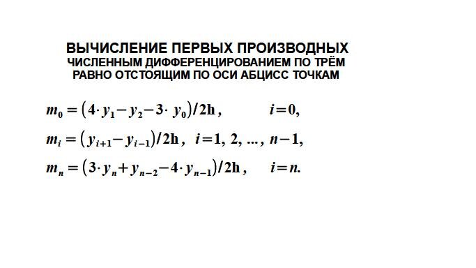 Значения первых производных в узлах вычисляется путём численного дифференцирования по трём равно отстоящим по оси абцисс точкам по формулам: