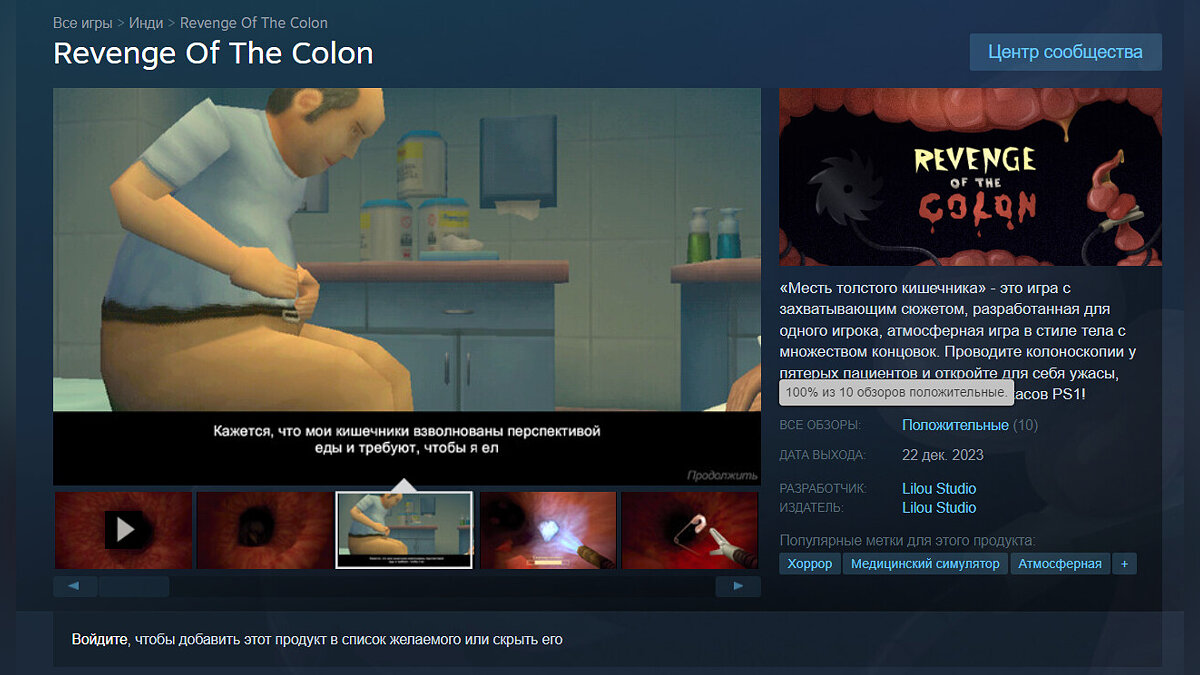 В Steam состоялся релиз необычной игры под названием Revenge Of The Colon, которая представляет собой симулятор гастроэнтеролога. На протяжении всего прохождения геймерам предстоит в буквальном смысле ковыряться в человеческих кишках, чтобы выявлять и лечить различные заболевания. Среди особенностей выделяют захватывающий сюжет (есть пять глав), несколько концовок и олдскульный визуальный стиль, вдохновленный играми для первой PlayStation. «Проводите колоноскопии у пятерых пациентов и откройте для себя ужасы, скрытые глубоко в них», — говорится в описании. Примечательно, что на момент написания новости игра имеет только положительные отзывы. Геймдев-революция!)