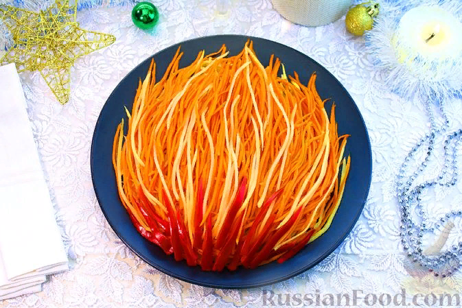 Салат "Огонь дракона" с курицей, картофелем и морковью по-корейски Яркий и пикантный салат "Огонь дракона" в виде пламени удачно впишется в новогоднее меню в год Дракона. Нежный вкус куриного филе и огурцов отлично дополняют пикантные морковь и картофель по-корейски. Эти компоненты хорошо сочетаются, салат получается с остринкой, что соответствует его внешнему виду. Праздничный салат "Дыхание дракона" отлично украсит стол в новый год 2024! Нам потребуется: Куриное филе - 300 г; Морковь по-корейски - 150 г; Картофель - по корейски - 150 г; Огурцы свежие - 150 г; Майонез - 80 г; Перец сладкий красный - 1 шт; .Лавровый лист - 2 шт; .Соль - по вкусу; Сахар - 1 щепотка. Способ приготовления: Отварить филе, огурцы нарезаем тонкой соломкой, добавляем по щепотке соли и сахара, после аккуратно отжимаем лишнюю жидкость, перемешиваем и оставляем на 8-10 минут, остывшее куриное филе разбираем на волокна, на тарелку (моя - диаметром 25 см) выкладываем слой куриного филе, сверху довольно обильно