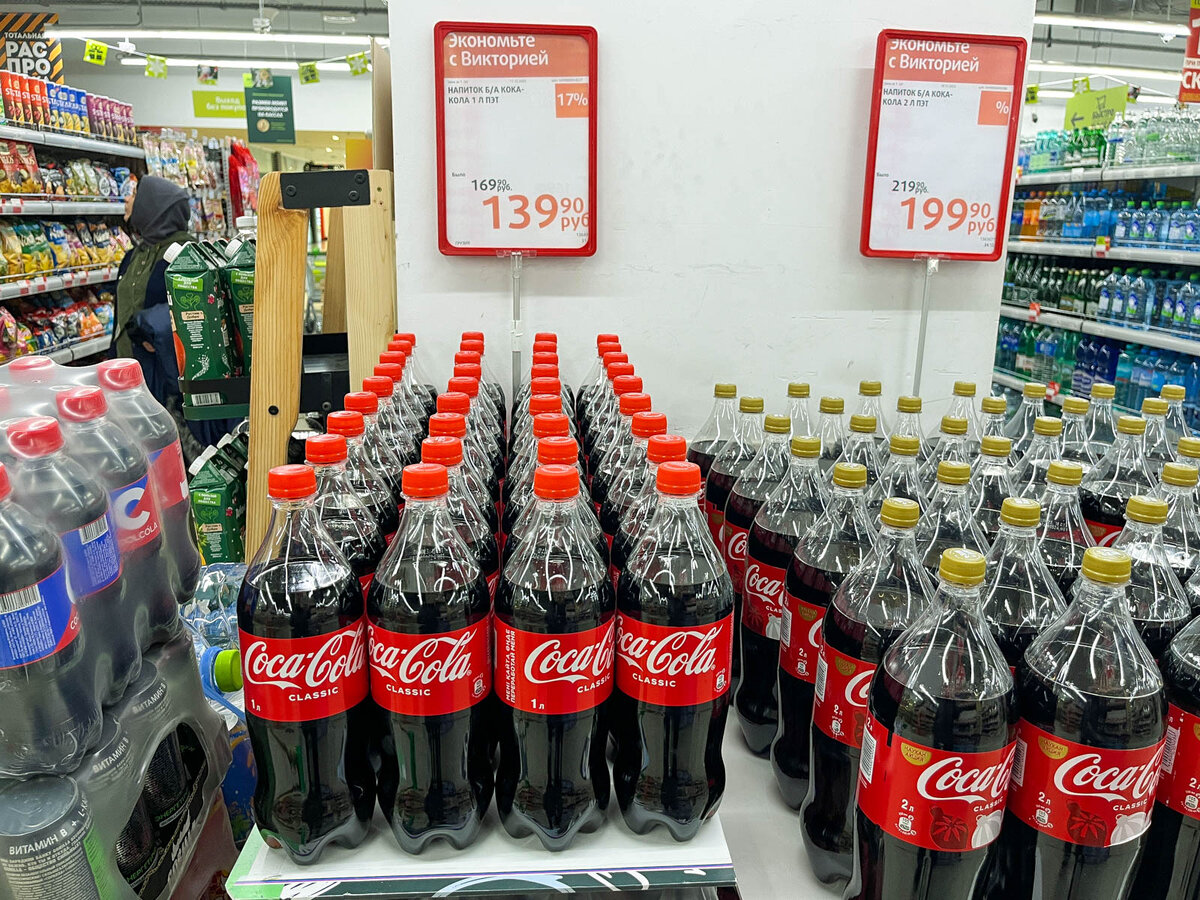 Сеть супермаркетов "Виктория" была основана в 1993 году в Калининграде. Благодаря близости к границе сетка имела отличную возможность закупать по низким ценам хорошие импортные товары, в том числе алкоголь. Позже "Виктории" начали открываться в Москве, и в конце 2000-х годов объединились с "Торкасом" (Дешево/Квартал). Еще несколько лет, и вся кубышка была выкуплена "Дикси". Отмечу, что у "Виктории" существовал отдельный менеджмент и в частности отдел закупок. В 2019-м часть магазинов продали Х5 Ритейл Групп и перебрендировали в "Перекрестки". Под раздачу попала "Виктория", в которой я иногда бывал (у метро Свиблово). В августе 23-го Х5 выкупил остатки сети, но вывеску "Виктория" пока оставил. В интернете пишут, ближайшие 2 года ребрендинга не будет. Входим в одну из двух десятков уцелевших Викторий. Справа большой паллет с Кока-Колой, которая якобы ушла из России. В "Спаре" бутылочка 0,33 в стеклянной бутылке стоит около 130 рублей. В Виктории за 140 можно выкупить целый литр. И там и