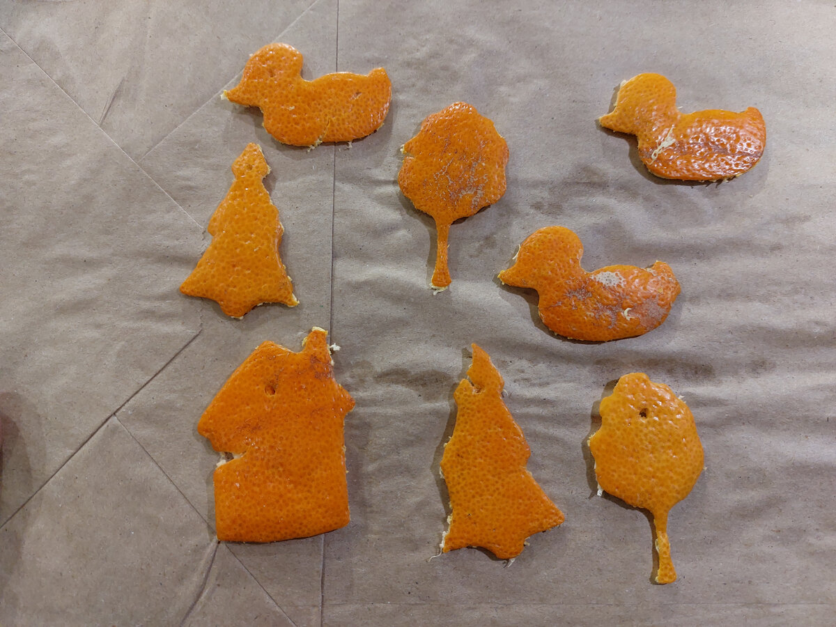 На третьей неделе "мама-дедмороз" уже подустала, а обстоятельства требовали отправить Васю к бабуле, так что стали случаться мелкие накладки с заданиями. То записочка потеряется, то выполнять задание некогда. Но мы стараемся, честно-честно! Итак, пятнадцатое задание - сделай фигурки из мандариновой кожуры и укрась ими елку. Саму записочку мы каким-то образом потеряли, поэтому покажу уже то, что получилось. Для вырезания мы использовали формочки для пластилина, я вырезала, а Васяня убирала лишнее и прокалывала дырочку. Потом вся эта красота почти неделю сохла на подоконнике под прессом, чтоб фигурки не свернулись при высыхании. Сейчас они уже высохли и ждут, когда приедет Вася, чтоб повесить их на елку. Шестнадцатое задание Василиса делала с бабулей, поэтому я немного его упростила и вместо шишки они украшали пластилиновыми шариками распечатанные на бумаге елочки. Можно было, конечно, и шишки использовать, но мы банально не смогли их собрать: в этом году за весь декабрь было 3 ясных дня