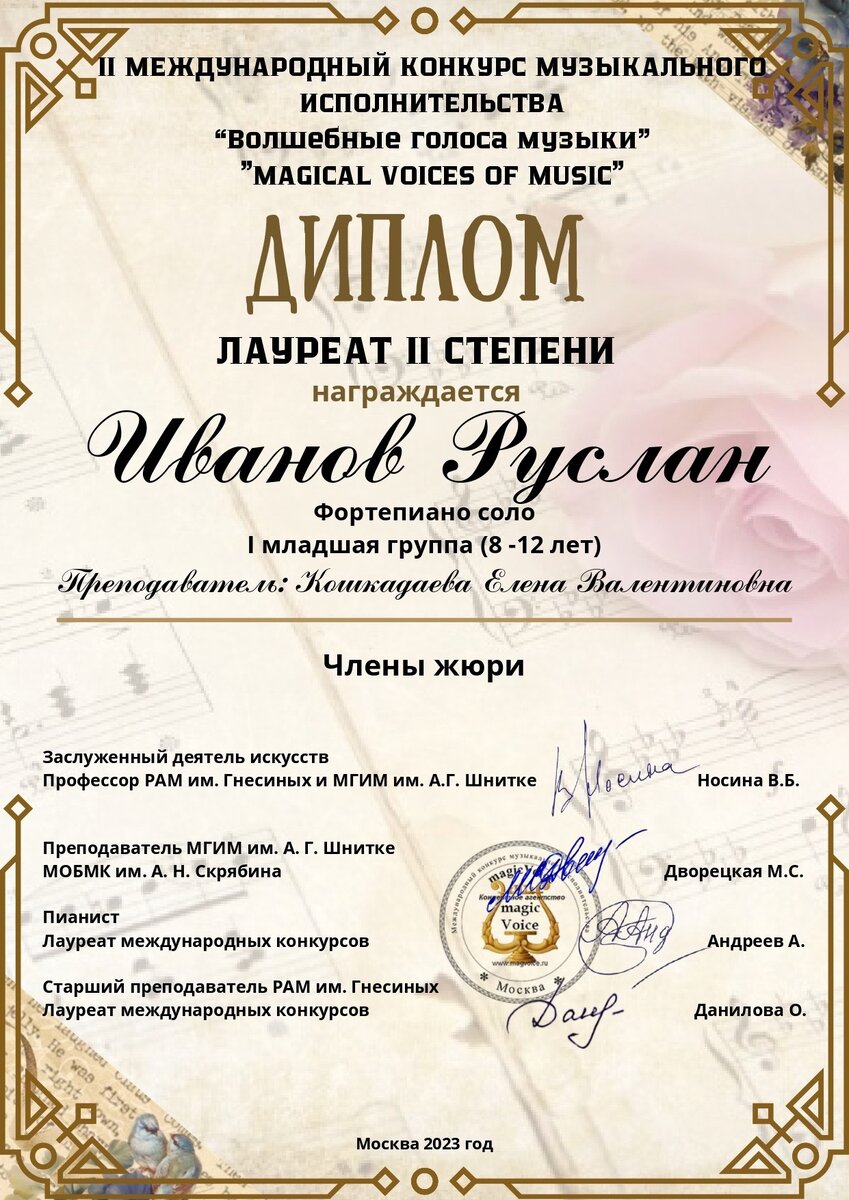 Поздравляем учащегося фортепианного отдела Иванова Руслана, класс преподавателя Кошкадаевой Елены Валентиновны с ПОБЕДОЙ во II Международном конкурсе музыкального исполнительства «Волшебные голоса музыки» Желаем дальнейших творческих успехов! 💫