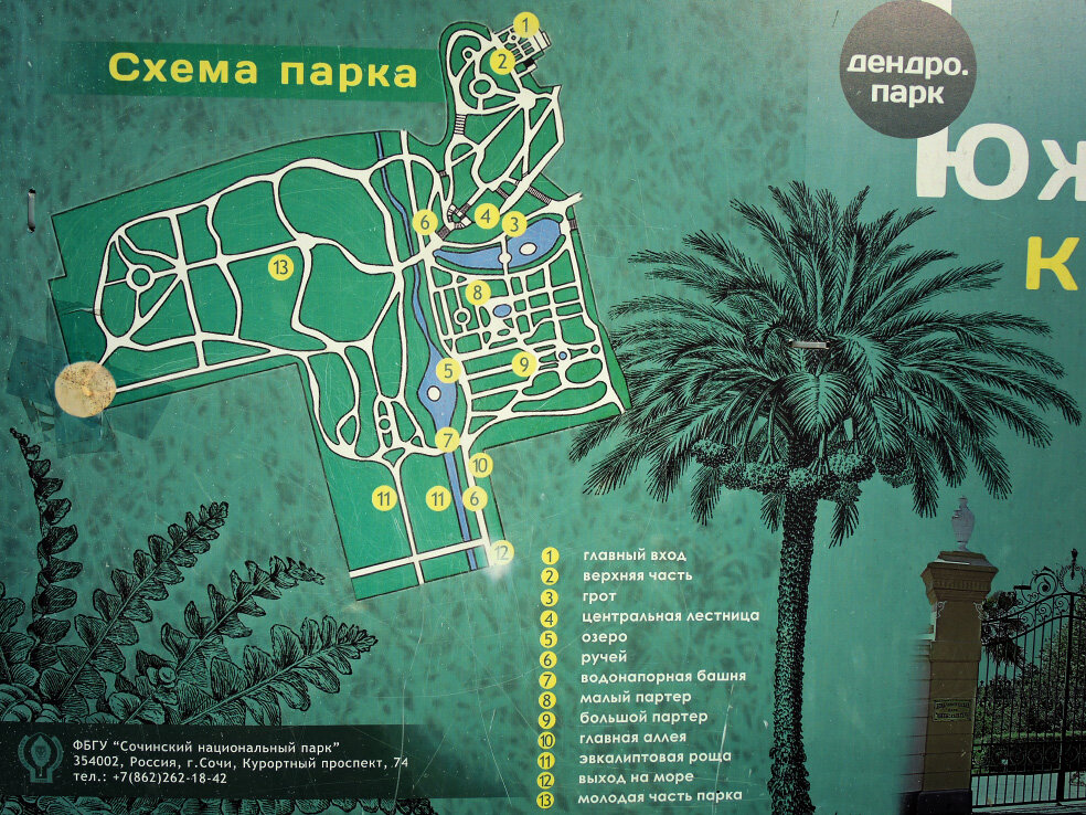 Продолжаю рассказ о поездке в Сочи (Адлер) в начале ноября 2017 года. Предыдущие части и рассказ о поездке сюда на Новый год 2020 можно посмотреть по ссылке ниже. В кадре - четвёртый день моего путешествия, 4 ноября. Мы прогуливаемся по парку «Южные культуры». В этой части предлагаю пройти вдоль ручья, который протекает по территории парка. На общей схеме он обозначен цифрой 6. Мы выходим к ручью около большого озера. Через русло здесь перекинут небольшой мостик. Дорожка от него ведёт в молодую часть парка. В районе центрального аллеи большого партера на ручье устроено ещё одно озеро. А на его берегу - смотровая площадка. С неё можно понаблюдать за живущими здесь птицами. А при желании - покормить их. На схеме озеро отмечено цифрой 5. Для поддержания уровня воды в искусственно расширенном русле ручья чуть ниже озера были установлены шлюзы и водонапорная башня. Номер 7 на общей схеме. Это один из немногих элементов оформления парка, сохранившихся от первоначального проекта. Продолжение