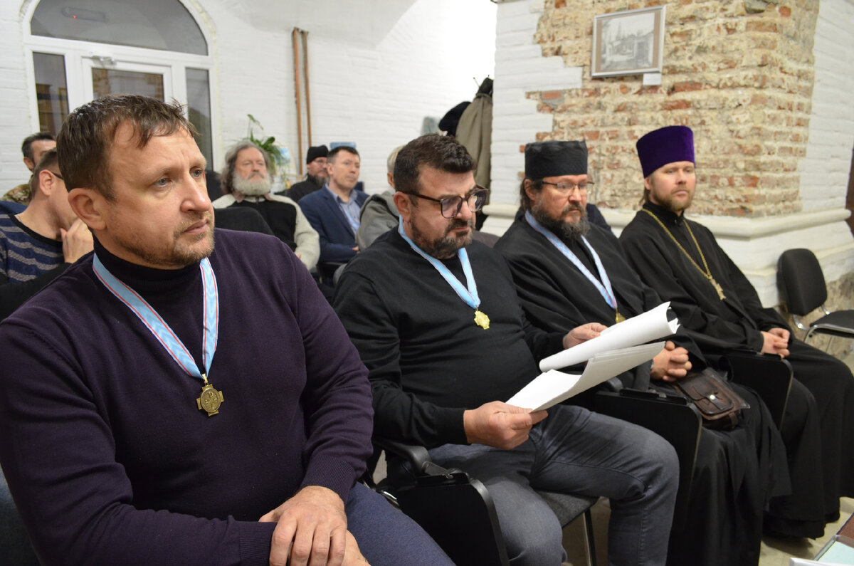 Собрание по традиции открылось с вручения членских билетов вступившим в этом году в ИППО. Кроме того, по поручению председателя Общества С.В. Степашина протоиерею Дионисию (Фокину), руководителю отдела по взаимодействию Церкви с обществом и СМИ Астраханской епархии, члену ИППО, была вручена медаль имени В.Н. Хитрово. Со словами благодарности в адрес отца Дионисия выступил председатель отделения Александр Соловьев, поблагодарив его за содействие в работе и поддержку в реализуемых проектах и вручив для библиотеки епархии вышедший в