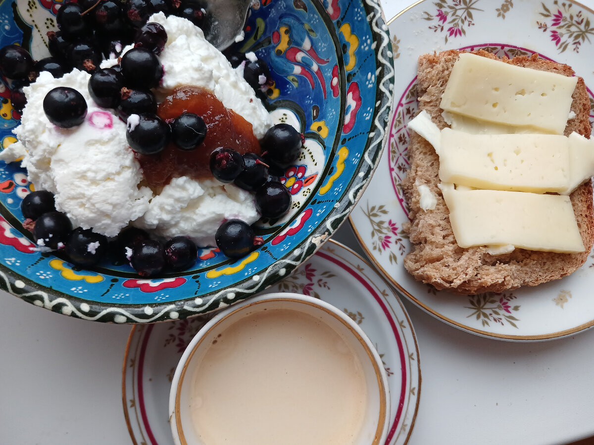 Завтракаем вкуснейшим творогом из цельного молока со сливками (Вкусвилл). Творог у меня с черной смородиной и медом, чашка кофе, бутерброд с сыром