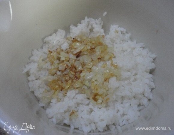 яйца куриные - 3шт. Шаг: 1 Отварить рис в подсоленной воде, откинуть на дуршлаг. Лук нарезать мелкими кубиками, обжарить в 1 ст. л. растительного масла и смешать с готовым рисом. Остудить и добавить яйцо, хорошо перемешать. Шаг: 2 Разъемную форму диаметром 18–20 см смазать сливочным маслом и обсыпать мукой. Из риса сформовать форму пирога — дно и бортики. Шаг: 3 Рыбу нарезать кусочками, посолить, поперчить, обвалять в муке и обжарить в раститель