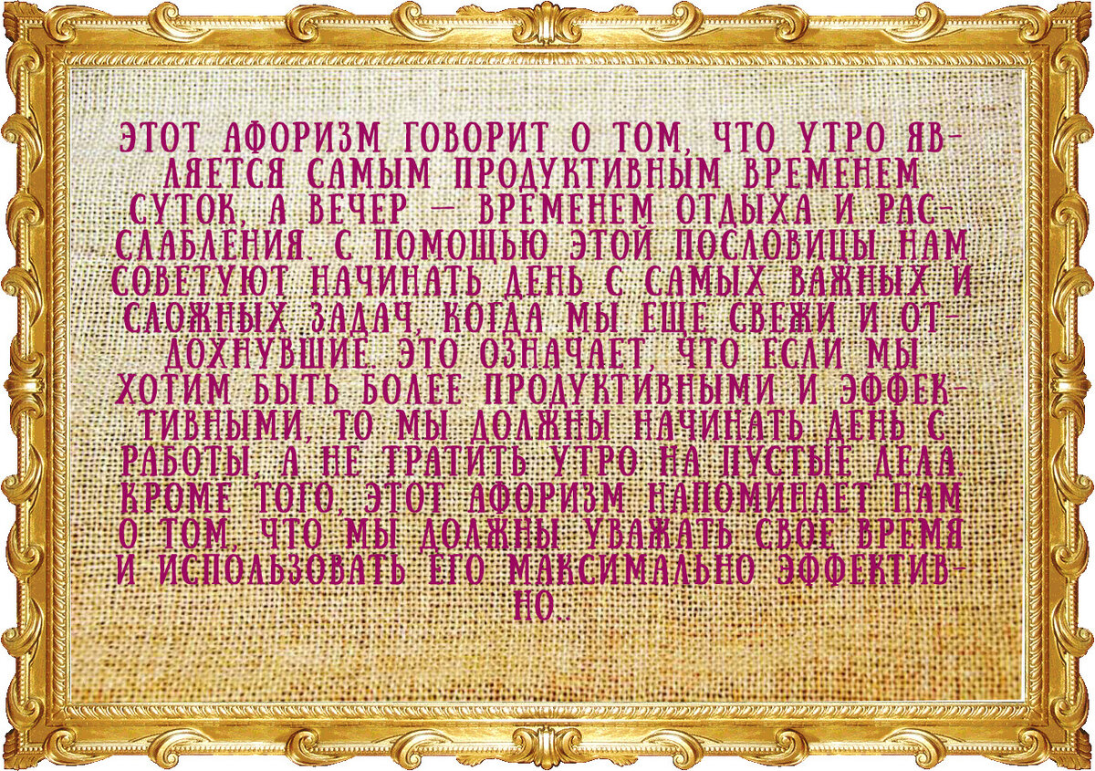 Дорогие друзья, в этой серии статей мы с Вами постараемся понять смысл пословиц, поговорок и афоризмов. Для более простого поиска нужного вам произведения, в запросе перед афоризмом ставьте знак '&', и перед знаком, и после текста ставим кавычки. Например: "& Не стыдно не знать, стыдно не учиться.". Усаживайтесь поудобнее и начнём. & Утро вечера мудренее. & Худой мир лучше доброй ссоры. & Что можешь сделать сегодня, не откладывай на завтра. & Что написано пером, того не вырубишь топором. & Хлеб — всему голова.