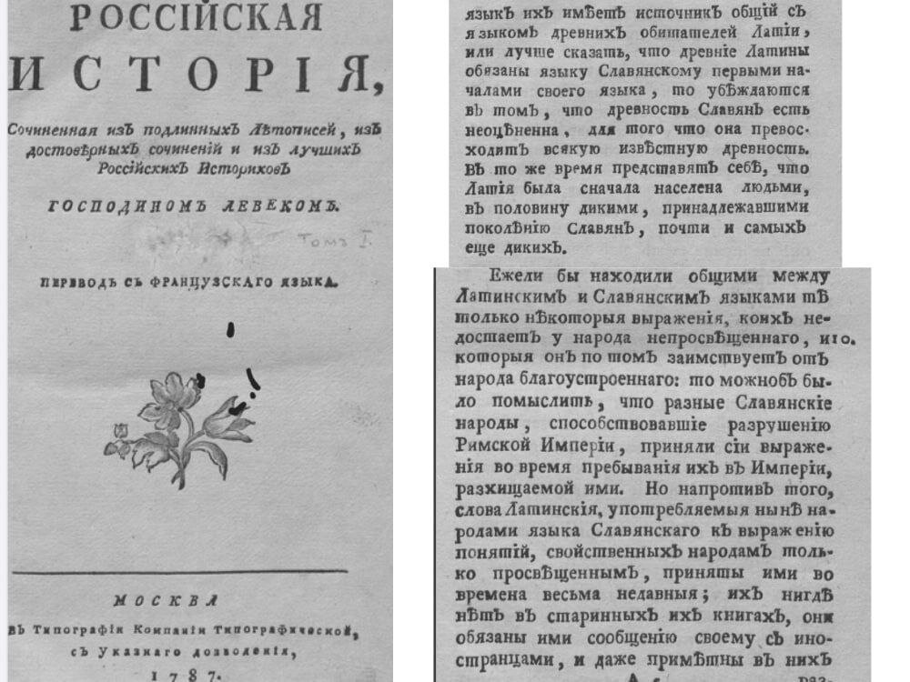 Доброго времени суток, друзья. На канале мы неоднократно касались темы исторических источников ( книг, карт, рукописей), содержащих в себе сведения, никак не вписывающиеся в ту историческую картину, которая внушается нам много лет. Сегодня есть желание продолжить эту тему. Мы расскажем еще о двух старинных работах европейских авторов, никак не заинтересованных приукрасить историю России (скорее бывает наоборот), содержащих непривычные для современного взгляда на прошлое сведения, а далее дело каждого - доверять этим сведениям или нет. Во второй половине 18 века французский историк Пьер Левек издал работу "Российская история". Опираясь на доступные ему в те годы источники, автор утверждает, что славяне "вышли из России и Польши, или, говоря языком древних, из Скифии". Он также пишет, что латынь, как язык древних римлян, произошла от языка древнеславянского, поскольку Италия, по его мнению, во многом была основана переселившимися на её земли славянскими родами. Книга содержит и другие лю