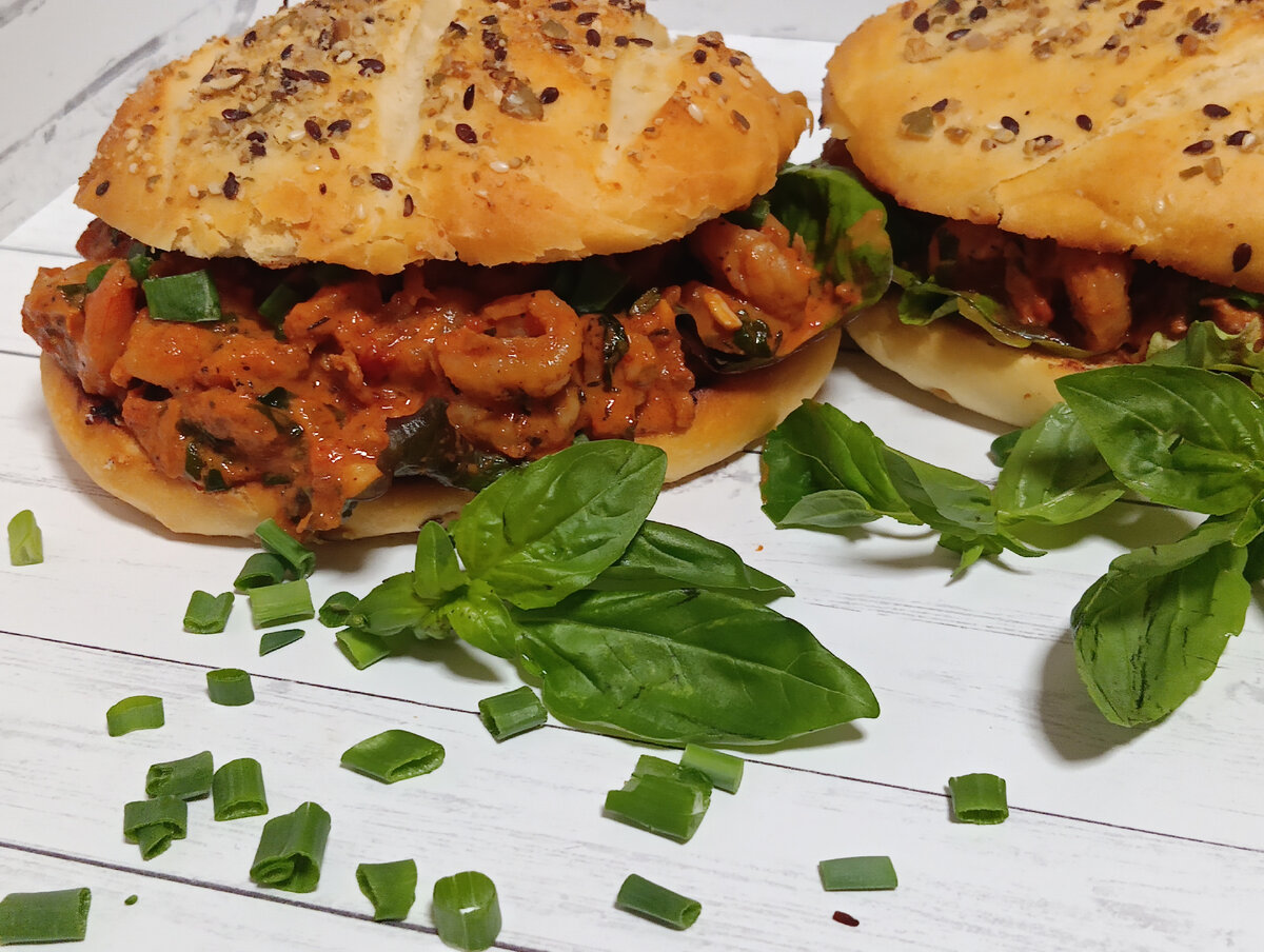 На нижнюю булочку выложите листья салата, сверху креветки в сливочно-томатном соусе и посыпьте нарезанным зеленым луком. Накройте верхней булочкой.