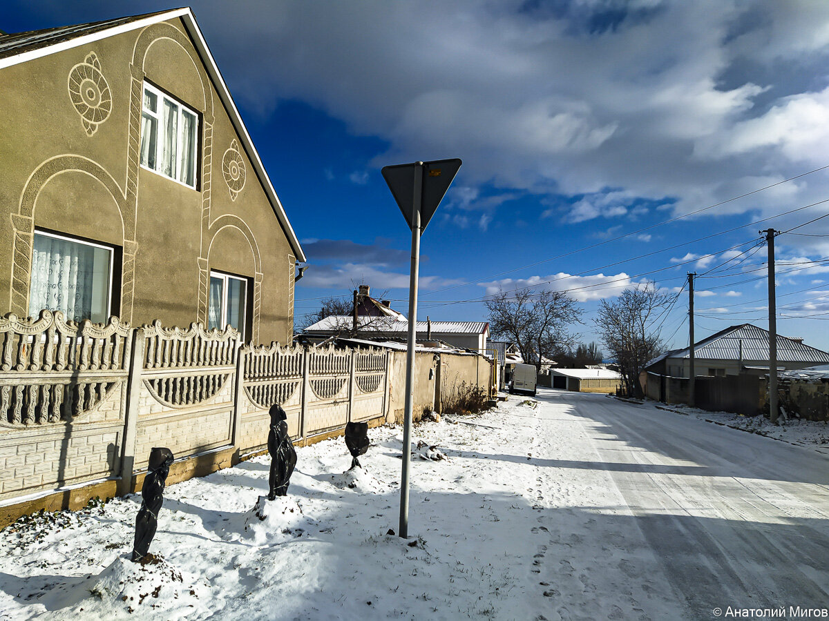 Вчера у нас снег срывался, срывался, а потом и совсем сорвался с катушек. Проснулись мы утром, собрались с Тильдой на прогулку, вышли на крыльцо, а там зима. Ладно бы просто снег, так ещё же и холодно. Целых -2 градуса. Хорошо ещё, что ветра нет, но всё равно сурово. Тильда быстро, как солдат после команды "Разойтись и оправиться!", сделала свои утренние дела, а потом уселась в задумчивости. Собачка, как и мы, не совсем оказалась готова к таким удивительным погодным сюрпризам. Впрочем, вскоре она почувствовала, что филейная часть охлаждается слишком ударными темпами, и приступила к нарезанию кругов вокруг дома. А я отправился на рынок по замерзшим за ночь старокрымским улицам. Впрочем, про рынок, я, как обычно, расскажу в понедельник, а сегодня покажу только птичью часть покупок - ведро семечек и приличный шматок сала. И семечки, и сало - это все для птичек. Написал сначала "для синичек", но потом поправился. Потому что у нас тут всякие разные пернатые прилетают кормиться - синицы, щ