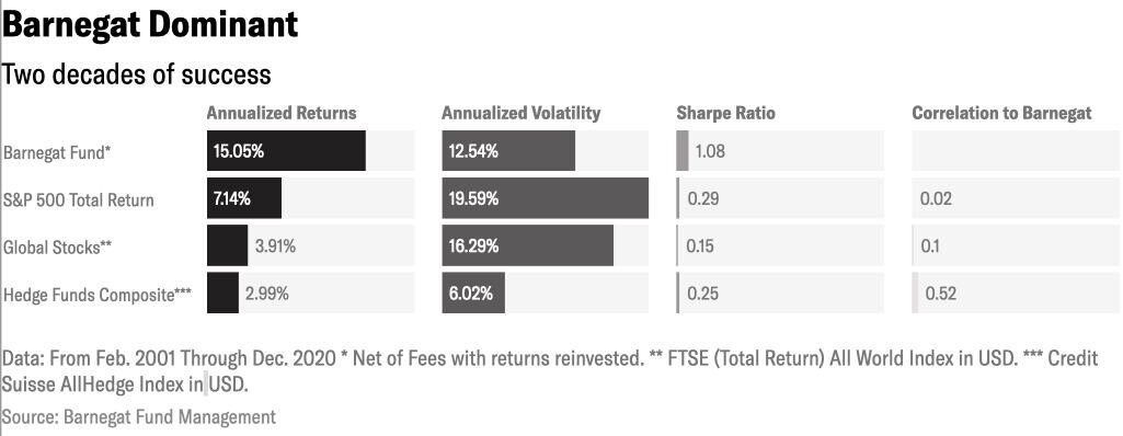 Результаты подтверждают эффективность мер, доходность хедж-фонда Боба Трю почти не коррелировалась с остальным рынком. С 2001 года среднегодовая доходность Barnegat составляла 15,05%. Для сравнения, это почти в два раза больше чем S&P500 (7,14%) при гораздо меньшей волатильности - 12,53%, против 19,59%.
