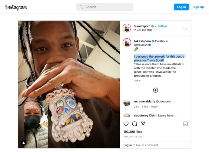 В посте Такаши Мураками в Instagram он написал: "Я создал арт-объект "Иисус" для Трэвиса Скотта".