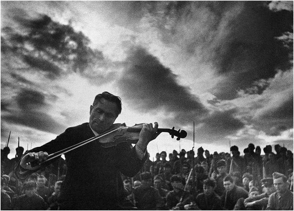 Была и другая категория людей, которые не попали на передовую всего лишь потому, что они были не пригодны к воинской службе или были слишком ценными «кадрами». Несмотря на это, такие люди старались помогать бойцам как могли. На снимке, сделанном в 1942 году, показан момент, когда профессор Московской консерватории П. Ильченко играет на скрипке для солдат Южного фронта и бойцы внимательно его слушают. И таких выступлений было немало.