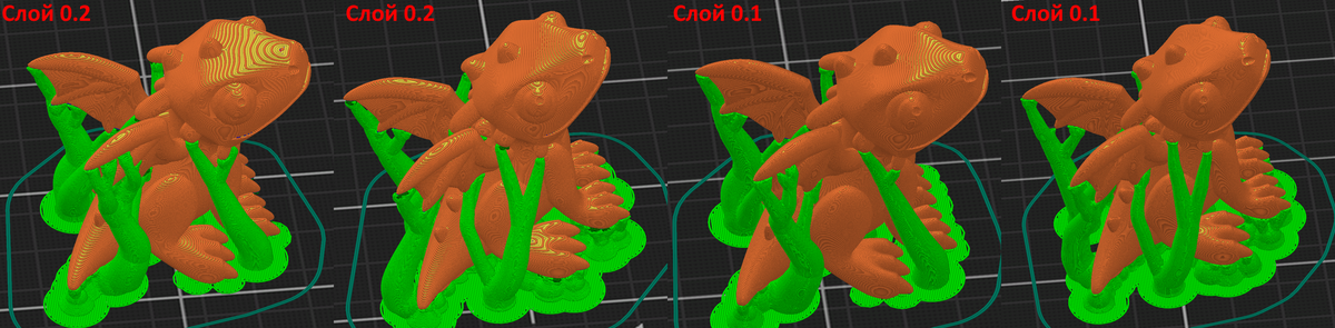 Ориентация модели при слайсинге имеет важное значение и все это знают. Но я возьму на себя смелость напомнить об этом новичкам и остальному 3D сообществу. Статья в первую очередь просвещенна FDM печати, т.к. в ней не много ухищрений для сокрытия слоев. Всем понятно что в послойной печати совсем избавиться от слоев не получится. На поверхностях близких к вертикальным слои смотрятся скорее как текстура поверхности, нежели дефект. Но проблема возникает когда поверхность имеет большую площадь и ее плоскость близка к горизонтальной, тут возникает хорошо известная "ступенька". Если площадь этих "ступенек" не велика, то хорошо сработает уменьшение высоты слоя. А функции "адаптивная величина слоя" в куре или "переменная величина слоя"/"модификатор диапазона высоты слоев" в прюше (к сожалению не работают с органическими поддержками), позволят сделать это для части модели, позволяя сокращая время печати. Одним изменением толщины слоя не всегда удается добиться подходящего р