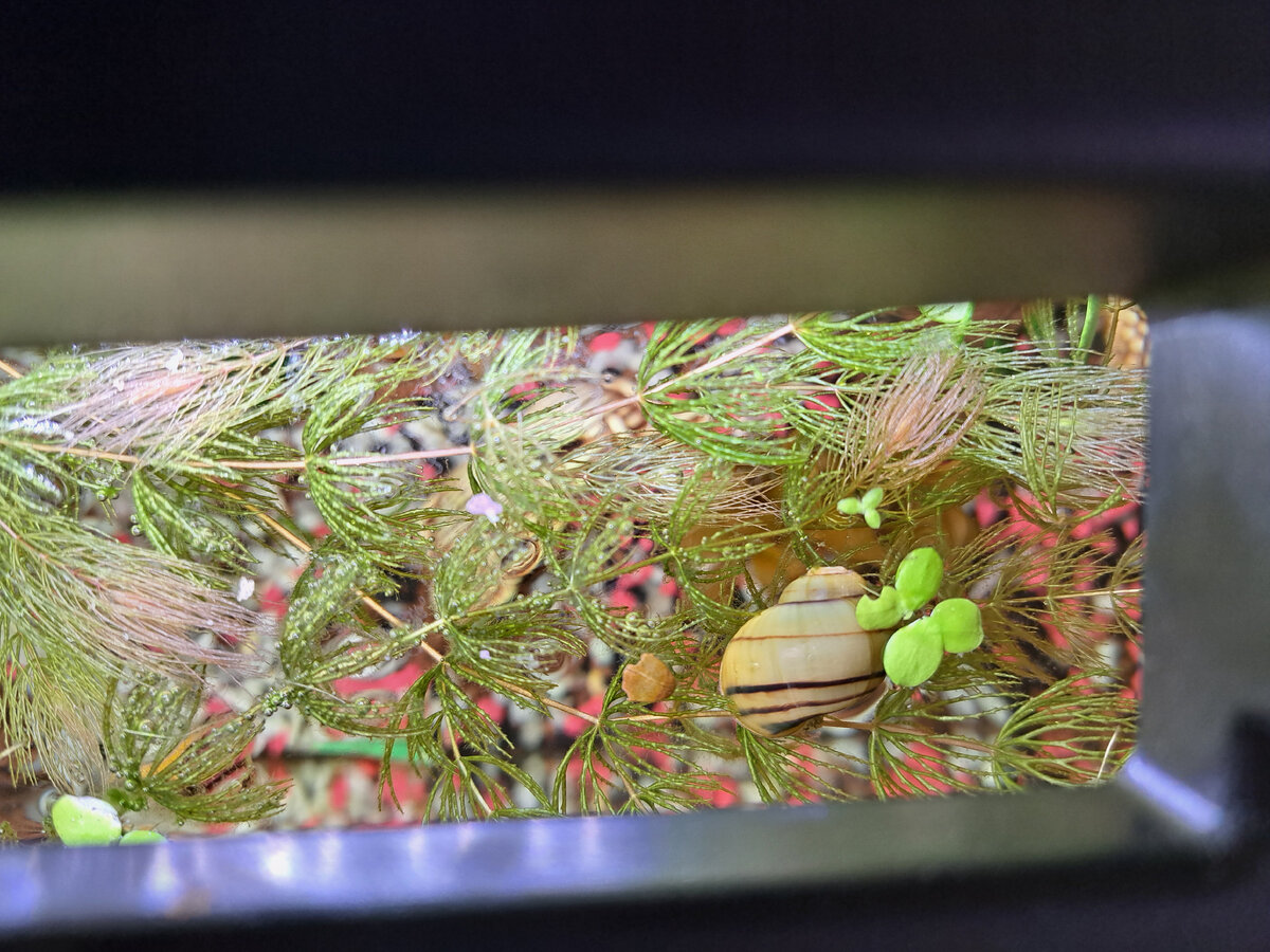 Сегодняшний день был интересен показательными выступлениями акробатического искусства. Улитка Кружок смог перебраться на плавающие на поверхности воды канаты роголистника, и продолжительное время балансировал на них. Затем он, ловко ухватившись, спустился и раскачивался на удивление всех жителей. Чем завершилось данное выступление мы, к сожалению, не знаем, т.к. отвлеклись на важные домашние дела. Надеемся, что приземление Кружка было мягким. Позже виртуозную чистку растений на высоте 30 см показал анциструс Белое Пятнышко. Вот такие таланты проживают в городе Аквариумбург:) Всем пока!
