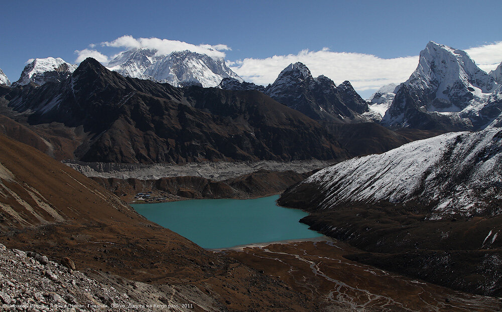 Вот так выглядит вид на озеро Dudh Pokhari и на поселок Гокьйо на полпути к перевалу Renjo Pass. Там за грядой семи- и восьмитысячников находятся Тибет и Китай. А справа на картинке видны две сказочные вершины Cholatse (6335 м) и Arakam Tse (6423 м). Они выглядят выше далекой гряды просто потому, что находятся к нам ближе.