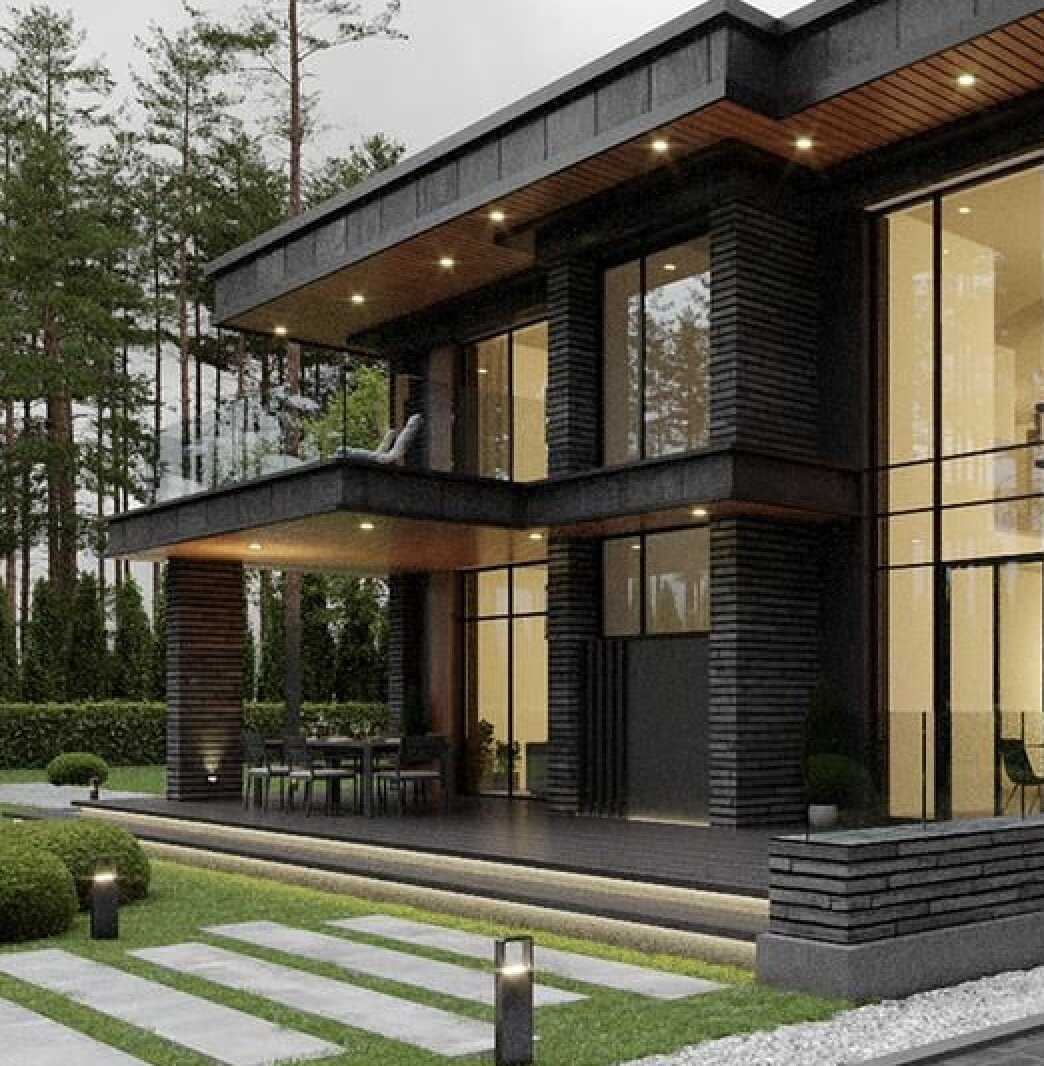От классического красного кирпича под кодовым названием «английский стиль», предпочтения Заказчиков перешли в сторону комбинирования различных материалов и сочетании ахроматичных цветов (белый, серый, черный), иногда с добавлением дерева и его природных оттенков. Интересно, что решение о применении светлых оттенков на фасаде - даётся Заказчикам легко и кажется универсальным решением для любой архитектуры. А вот, что касается чёрного – здесь всегда много сомнений. Во время обсуждений фасадных решений мы часто слышим такие слова как: «тяжело», «мрачно», «будет давить». Основательны ли эти сомнения? Да. Но только, если выбор материалов и их комбинирование на фасаде происходит бездумно, без привязки к архитектуре. Именно материалы и цветовые сочетания играют самую важную роль в формировании пропорционального и ритмичного строя сооружения. Поэтому, если вы любите, но переживаете о том, как будут смотреться темные оттенки на вашем доме, доверьте работу по подбору фасадных решений профессиона
