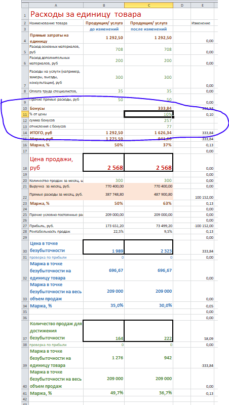 Для стимулирования работы продавца, как правило, устанавливают бонусы с продаж. Оценить влияние бонусов на прибыль предприятия и заплату продавца можно при помощи этой модели Формулы к модели Как это работает. Из первого рисунка видно, что бонусы при сохранении величины продаж и постоянной части заработной платы продавца приводят к убыткам Очевидно, что при установлении бонусов необходимо снизить постоянную часть заработной платы. Подобрать наиболее приемлемое для предприятия сочетание бонуса и постоянной части заработной платы можно при помощи этой модели. Для примера, установим бонус на уровне 5% и сократим постоянную заботную плату продавца на 50% (просто введем эти числа в соответствующие ячейки и модель пересчитается сама) Модель показала, что даже при снижении постоянной части заработной платы на 50% продавец при такой системе существенной выигрывает в заработной плате, а предприятие снижает прибыль. Таким образом, вводить бонусы при сохранении объема продаж не целесообразно. Э
