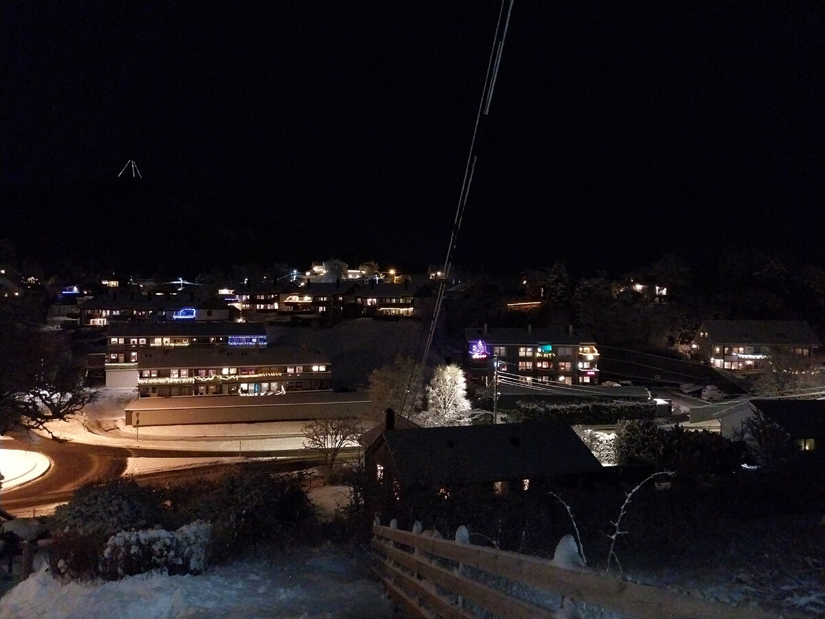 Очень приятно в предрождественский вечер пройтись по улицам норвежской деревни, любуясь праздничной иллюминацией и саежевыпавшим снежком. Огоньки-фонарики кое-где даже в асфальтовые пешеходные дорожки вмонтированы. Кругом свечи-огоньки и огромные вифлеемские звезды на фоне незанавешенных в большинстве домов окон. Ни одного глухого забора или закрытых наглухо ворот-калиток. Все готово к встрече Рождества. Стелла Ларсен.