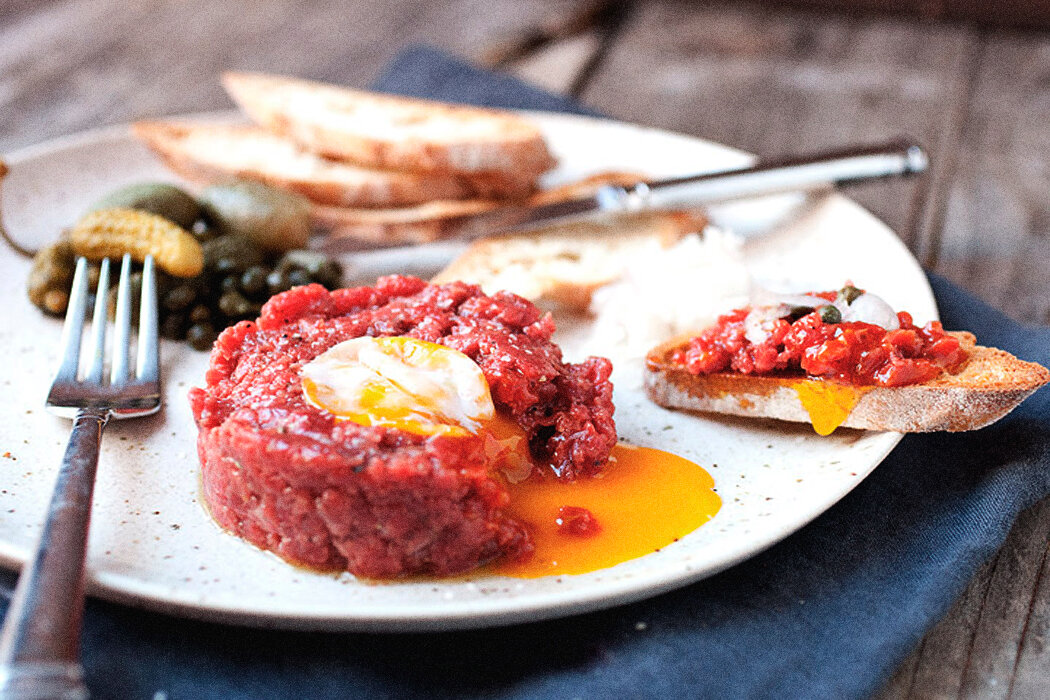 Тар-тар - это классическое французское блюдо, которое обычно готовят из сырого мяса или рыбы, нарезанного мелкими кубиками и смешанного с различными соусами и специями. Вот простой рецепт тар-тара из говядины:Вот как его приготовить: Ингредиенты: - 300 г свежей говядины (лучше всего использовать высококачественное мясо) - 1 небольшая луковица - 2-3 соленых огурца - 1 столовая ложка каперсов - 2 столовые ложки майонеза - 1 столовая ложка дижонской горчицы - Сок половины лимона - Соль и свежемолотый черный перец по вкусу - Свежая зелень для украшения Инструкции: 1. Начните с подготовки мяса. Очистите его от жил и жировых прослоек, затем нарежьте на маленькие кубики. Поместите мясо в миску и поставьте в холодильник на 15-20 минут, чтобы оно остыло. 2. В это время мелко нарежьте луковицу, огурцы и каперсы. Переложите их в отдельную миску. 3. В другой миске смешайте майонез, горчицу и лимонный сок. Добавьте соль и перец по вкусу. 4. Добавьте нарезанные овощи и каперсы к мясу. Перемешайте, ч