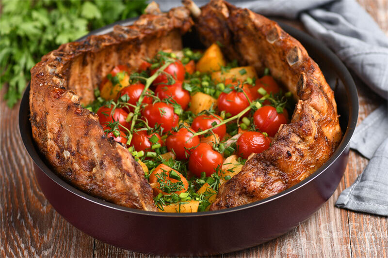 Это не только вкусное и ароматное, но и очень красивое блюдо. А в приготовлении простое. Свиные ребрышки готовлю разными способами. Выдерживаю их недолго в разных маринадах, запекаю отдельно или дополняю овощами, просто обжариваю на сковороде, тушу или готовлю в аэрогриле. Вариантов множество. Сегодня будут вкуснейшие свиные ребрышки с овощами в духовке. Блюдо получается красивое за счет определенного расположения ребрышек. Овощи могут быть любые: плотные корнеплоды или сочные овощи. Все овощи становятся мягкими, а за счет соков от свинины они получаются очень вкусными. Порции 4-5 Время подготовки 15 минут Время приготовления 1,5 часа Ингредиенты Инструкции 1. Ребрышки промываем и удаляем пленку. 2. Затем их солим, посыпаем специями (у меня сухая смесь Аджика состоит из сушеной зелени, разного перца, кориандра и хмели-сунели), молотой паприкой (1 ч. л. с горкой), поливаем маслом (2 ст. л.) и распределяем пальцами по всей поверхности. Оставляем на столе, пока подготавливаем овощи. 3. В