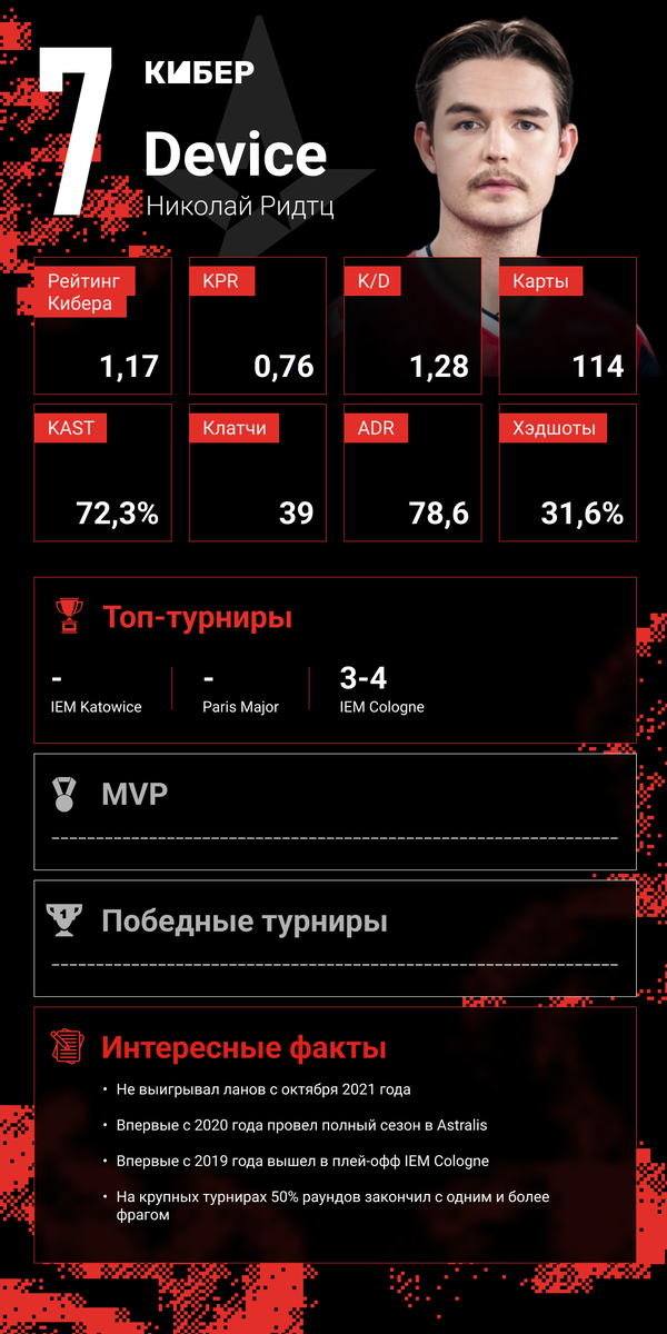 Если бы команда Девайса попала на мейджор или в Катовице либо не провалилась хотя бы на одном турнире от Blast, то он мог бы претендовать на попадание в пятерку. 2023 год был для него разгонным – ждем успехов в обновленном составе.