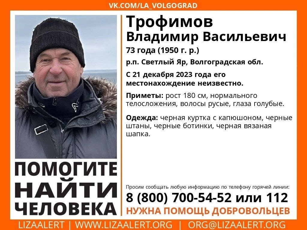 В Волгоградской области бесследно пропал 73-летний Владимир Трофимов. Подробности сообщили в поисковом отряде «Лиза Алерт». Пожилой житель поселка Светлый Яр вышел из дома 21 декабря, с тех по о нем нет никаких известий. Мужчина оделся потеплее — на нем были черные куртка с капюшоном, такого же цвета штаны, ботинки, и темная вязаная шапка. Владимир Трофимов высокий, нормального телосложения, у него русые волосы и голубые глаза. Для поисков мужчины нужна помощь добровольцев. Также в Волгограде продолжается активный поиск 28-летнего Павла Семенкова, который пропал 20 декабря. Ранее жители Волгограда сообщили о том, что во время поездки в автобусе видели пропавшего год назад 20-летнего Александра Рудакова. По словам очевидцев, молодой человек выглядел растерянно и при себе не имел денег за проезд. Александр считается пропавшим с 29 апреля. Он нуждается в медицинской помощи, у него растет годовалая дочь. Анна Анатольева