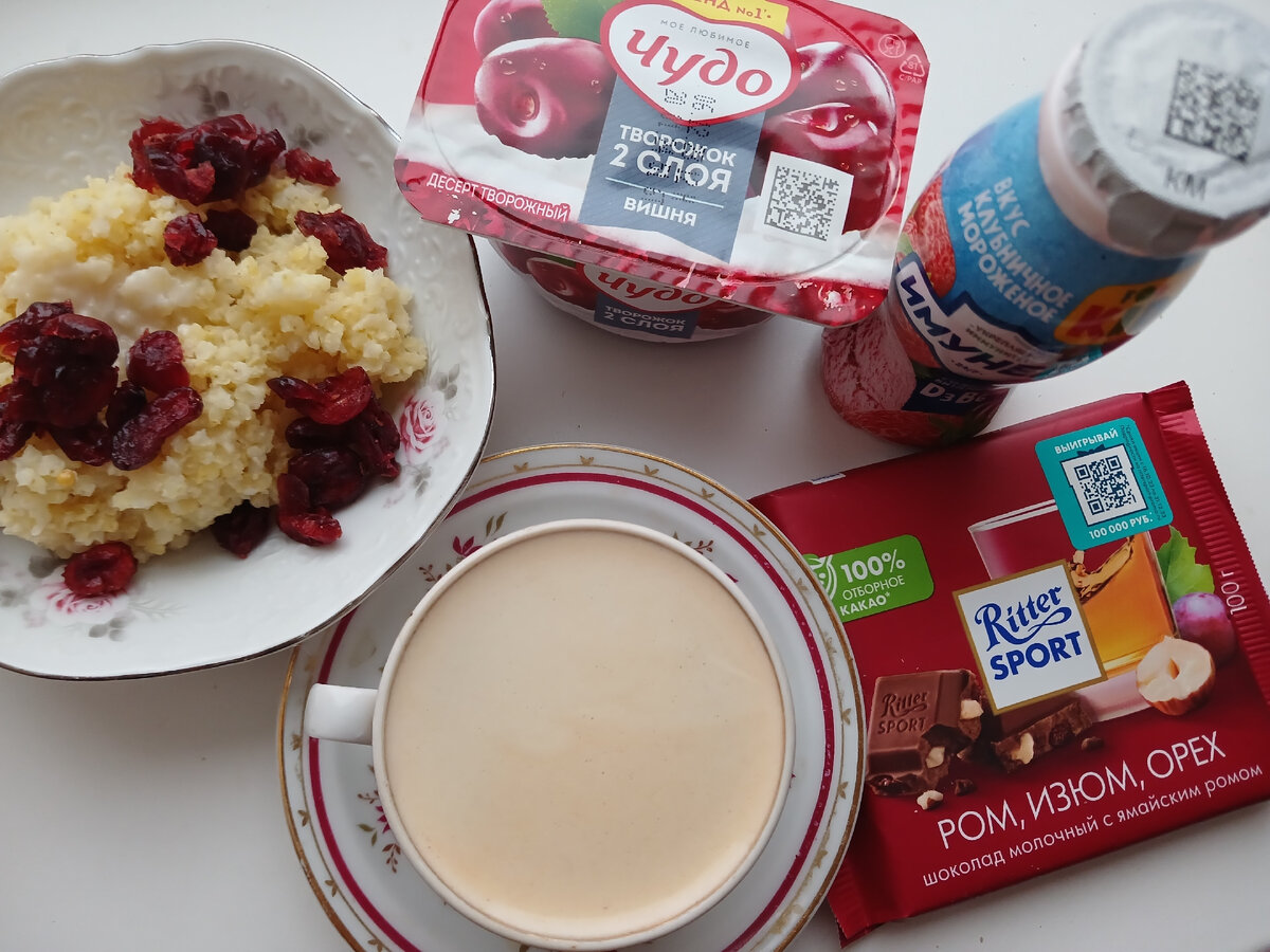 Идет третий месяц нашего Экономного марафона. Многие из вас меня поддержали, так что мы марафоним большой командой💪 О моих запасах и расчете бюджета на месяц ЗДЕСЬ Покупка продуктов 1 -Озон, WB, Дикси, Пятерочка, рынок, Вкусвилл Покупка продуктов 2 - Tasty Coffee, мёд, КБ, Дикси, рынок Покупка продуктов 3- Метро, Пятерочка, Вкусвилл, WB Каталог рецептов Накупили творожков в магазине ВБД, теперь буду их включать в меню завтраков. Сегодня снова пшенная каша с вяленой клюквой, творожок с вишней, имунеле, кофе и шоколадка. Этюд в бордовых тонах 🤗 По поводу творожков поясню: мы не покупали их лет ...ну 5 так точно. Вообще не помню, когда покупали до этого. Ни разу за почти 3 года ведения блога такое Чудо тут не появлялось. Так что пусть будут в виде баловства. Для меня сильно сладкие они. Еще верхушку творожную могу есть, а внизу фруктовый слой прям приторный. По составу они тоже вполне себе приемлемые. Не сравнить, конечно, с творогом и ягодами, но за 10 руб вполне могут быть. После